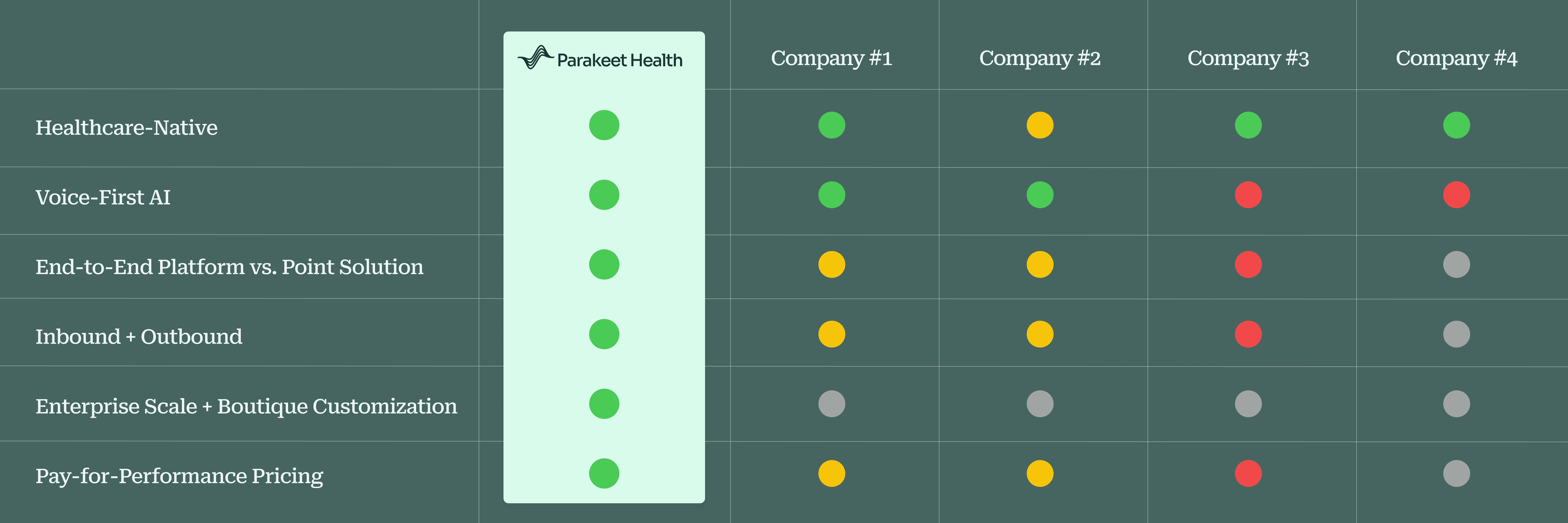 Based on a six-dimension comparison of leading platforms, Parakeet Health is the only solution that combines healthcare-native voice AI, end-to-end platform coverage (scheduling, recall, referrals, cancellation backfill, and more), unified inbound and outbound capability, pay-for performance pricing, and enterprise-scale deployment in 4–6 weeks.