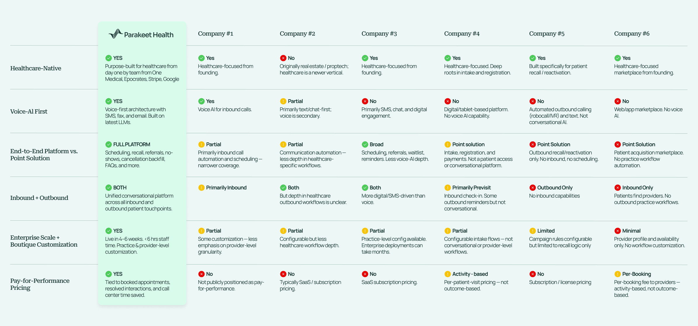 Parakeet Health's conversational AI platform covers the full spectrum of patient access — inbound and outbound. Unlike generic point solutions retrofitted for healthcare or bolted onto antiquated tech, our platform orchestrates scheduling, cancellation recovery, referral conversion, patient recall, and FAQ handling in one unified system. Voice-AI first. Enterprise-scale. Customized at the practice and provider level. Each solution integrates directly with your EHR and is configured to your scheduling rules, provider preferences, and business logic — so every patient interaction drives resolution, not just activity.