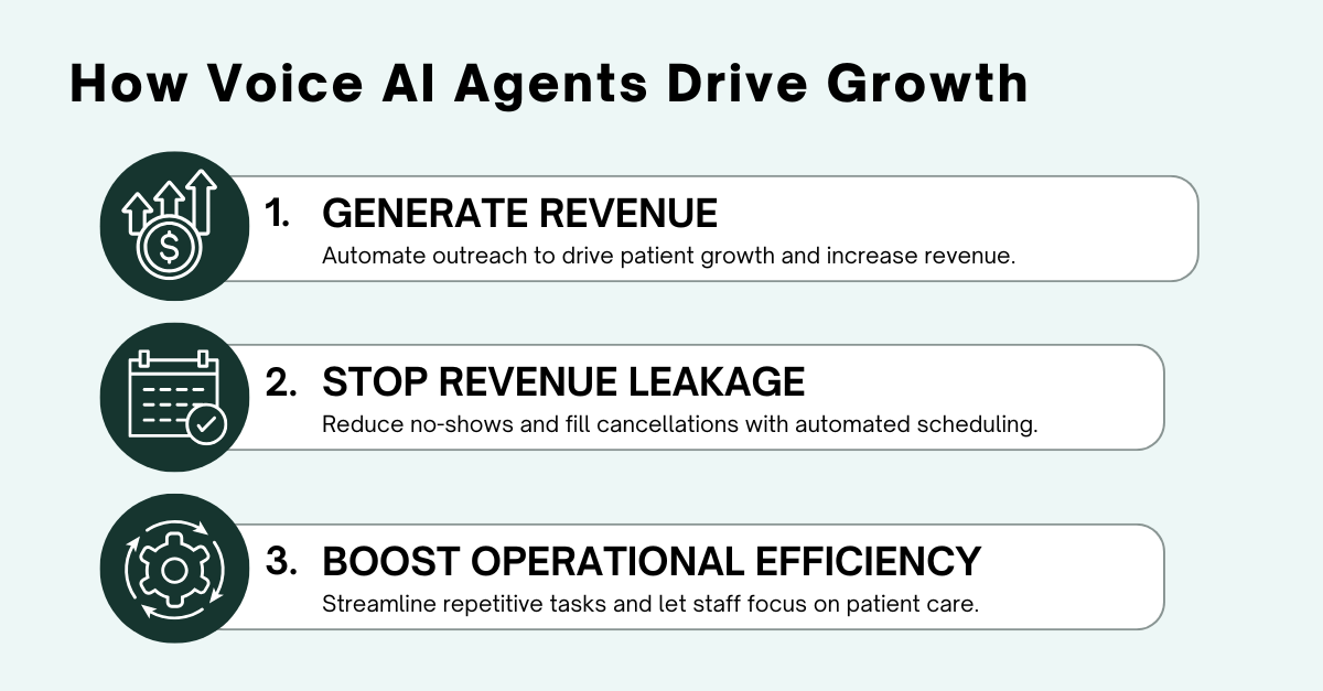 Your call center doesn’t have to be a cost center. With AI call center agents, you can turn missed opportunities into measurable growth. From boosting patient visits to streamlining operations, automation allows your team to focus on meaningful, patient-centered interactions while driving revenue.